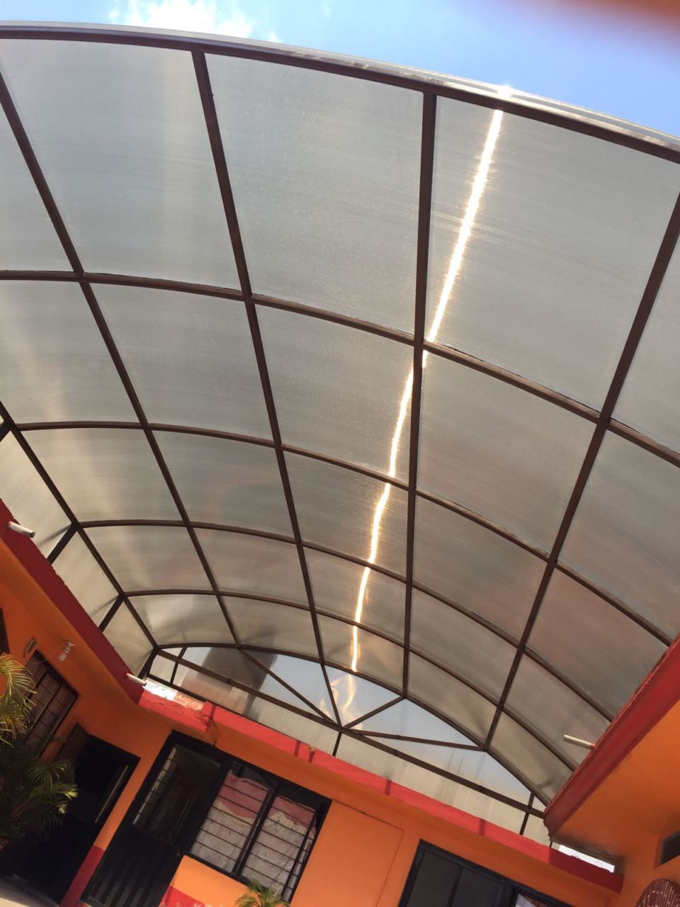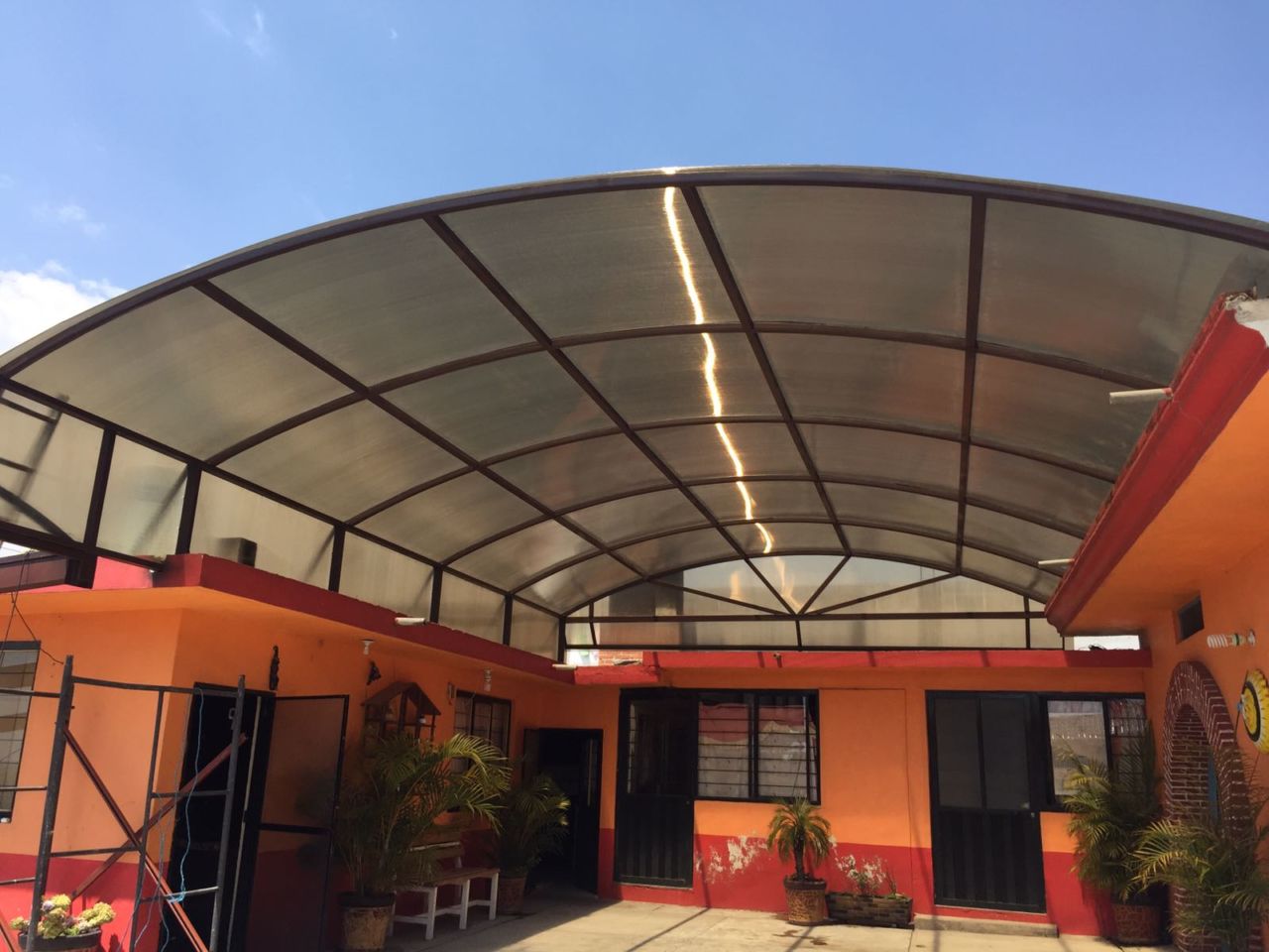 Arco cañón con estructura metálica rolada color chocolate y cubierta por lámina policarbonato color bronce